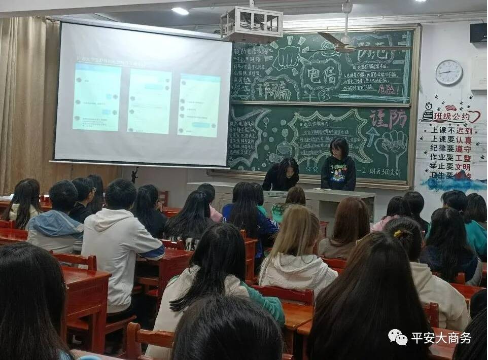 为了让我们大学生在平常学习之余,同时增加自身的社会经验,加强社会适应能力,重视安全教育,提高自身的安全防范意识。2021年11月2日下午,各班组织开展防诈骗主题班会,宣传相关安全知识,提高安全意识 。