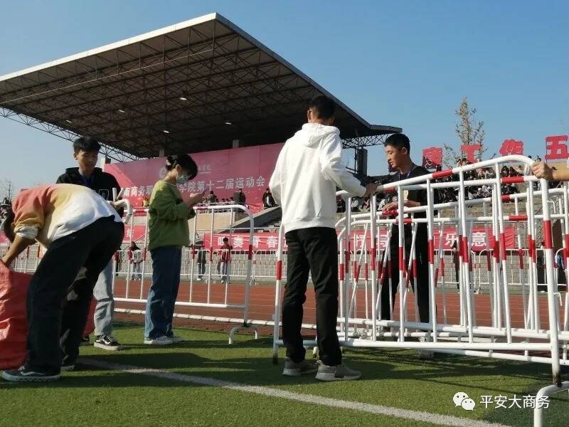 2021年11月13日这天,清风徐来,阳光洒在地面上,一年一度的校运会在田径场举行开幕式,同学们怀着期待的心情参与校运会,各个二级学院都相应准备了节目:充满青春的啦啦操、国风浓郁的舞曲……使我们大饱眼福,大家注意到了田径场上醒目的白色用具-栅栏了吗!负责搬运他们的就是我们的幕后工作者-学生治保委员会,校运会的顺利开幕离不开他们的努力。太阳公公起了个早床,草坪上的露珠还在呼呼睡着大觉,田径场上便开始陆陆续续地来人了,三三两两,来的人正是学生治保委员会的成员,他们手里拿着早餐,因为校运会开幕式即将开始,所以提前在田径场进行准备工作。