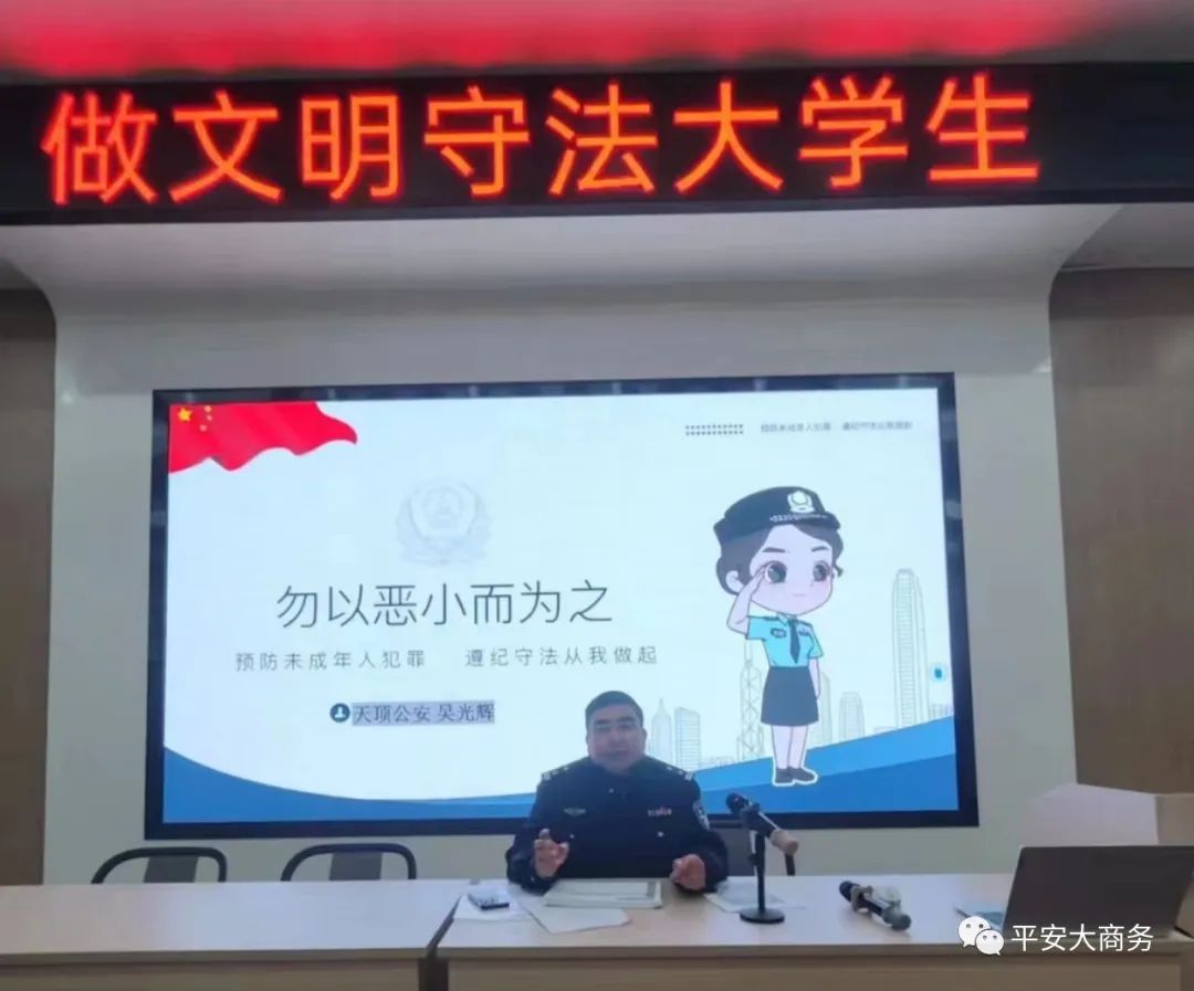 (通讯员骆静莹 摄像刘青 吴豫香 李婧)为进一步增强全校学生的法治观念和法律意识,培养知法守法的合格大学生,于2023年11月16日一教101学校邀请天顶派出所的吴光辉警官为我们开展了一场“做文明守法大学生”安全知识主题讲座活动。