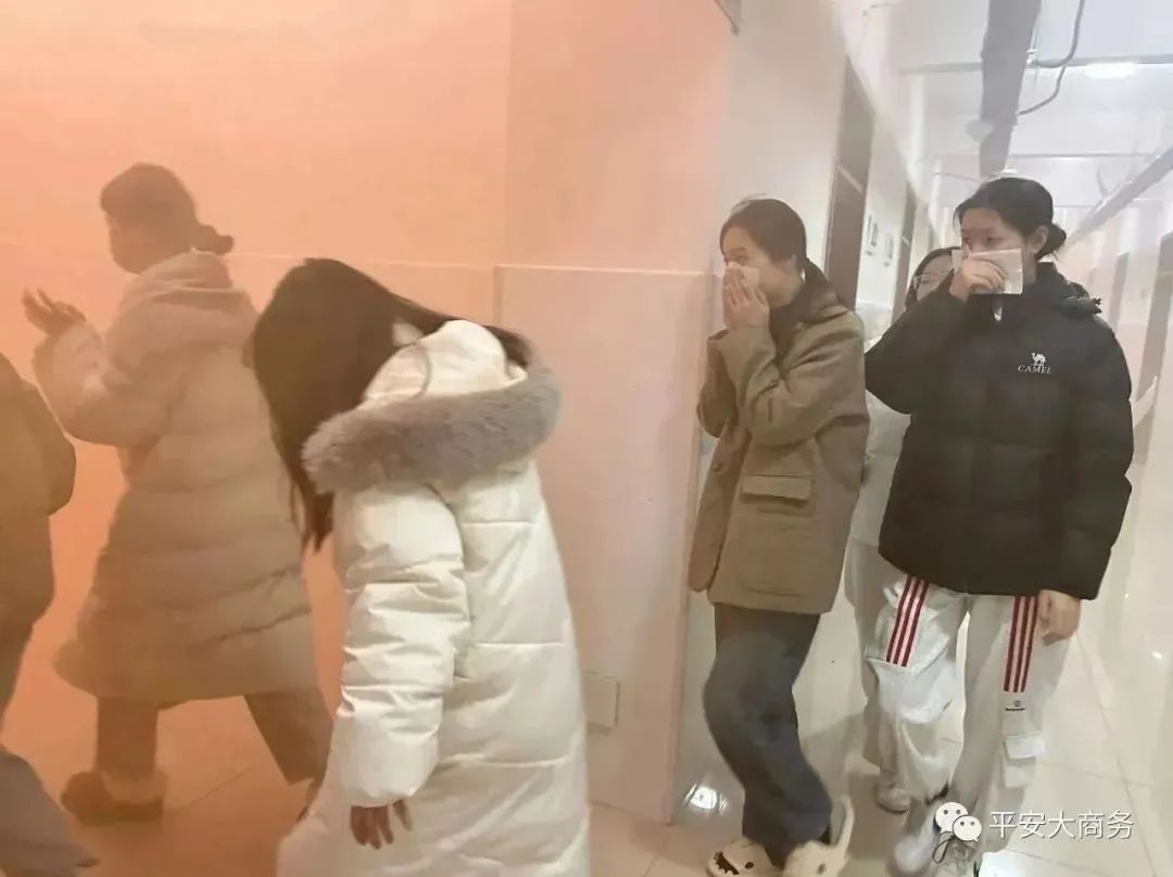 7点20分,宁静的校园突然响起了急促循环的警报声,烟雾瞬间蔓延开来,宿舍管理员通过广播不断提醒学生要有序、安全疏散,撤离到田径场集合。疏散过程中,学生们用衣袖、毛巾、湿纸巾捂住口鼻,按照规划好的逃生路线,弯腰快速前行,力争在规定时间内安全有序撤离到安全地带。到达疏散地点后以寝室为单位排队,各室长清点人数并报告老师。