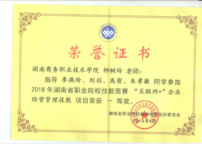 1、2018年湖南省职业院校互联网+企业经营管理技能大赛团体一等奖