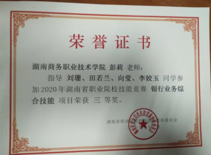 5、2020年湖南省职业院校技能竞赛银行业务综合技能大赛团体三等奖。