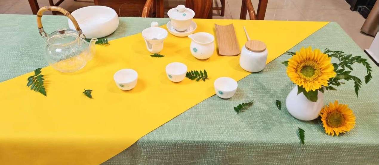 茶席布置与茶艺展示模块是理论与美学、技艺的深度融合。实训前,教师梳理茶席设计的空间美学、茶具搭配的文化逻辑等理论要点;实操时,同学们既互帮互助——有同学分享节气物候的文献资料,有小组交流传统节俗的茶席呈现技巧,有小组借调特色茶具完善席面风格,又各显创意——有的以“禅茶一味”为核心,用枯木枝、黑陶茶壶营造空灵意境;有的融合节气的时序智慧,以青纱似流水,棕麻仿松木打造高山流水的自然情境;茶艺展示中,同学们将冲泡技艺理论(如水温控制、注水手法)融入动作,让茶汤品质与茶艺美感相得益彰。