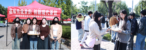 此外,此次活动邀请了校企合作单位的茶饮品牌茶守艺联动宣传,活动现场有茶守艺品牌产品展示、免费赠饮和优惠券发放等活动。同时,我校茶艺队也在此次活动中展露风采。茶艺队负责了校园内茶席设计与美学展示,四个不同风格的茶席台上由茶艺师们演示中国工夫茶艺冲泡,邀请校园内爱茶人士共饮一杯功夫茶。