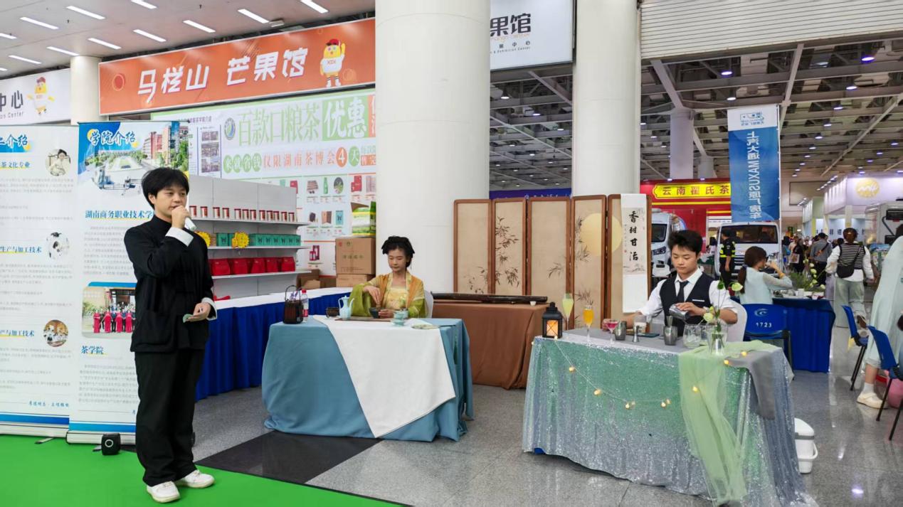 展会期间,茶学院的展区成为现场焦点之一。学生们以茶为媒,带来了一系列专业且富创意的展示:在茶艺表演区,他们或身着宋代雅致服饰,或搭配现代简约装束,在古雅与时尚的碰撞间,巧妙融合宋代点茶与新中式调饮,表演者先是专注碾茶、细腻调膏,再以茶筅轻击茶汤,直至茶汤泛起满盏乳花,尽显古代点茶的雅致;随后又灵活融入鲜奶等食材,调制出兼具传统茶香与现代风味的特调茶饮,这份刚柔并济的演绎,引得观众纷纷驻足观赏、拍照记录。在品茗区,学生们化身专业茶侍,精选湖南特色茶品,凭借课堂所学的专业冲泡技艺,精准把控水温与出汤时长,为往来茶客斟泡香茗;茶客们手捧茶盏细细品味,醇厚茶香搭配学生的贴心服务,让不少人频频点头称赞。在茶席设计区,学生们以 “青春茶韵” 为主题搭建茶席,将现代审美与传统茶文化相融合,巧用花草、木、瓷等天然元素,营造出简约而富有诗意的品茗空间,也传递出年轻一代对茶文化的创新表达。