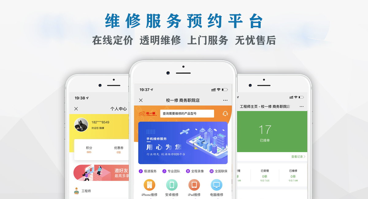 校一修,高校校园O2O维修综合服务平台,隶属于长沙市校易修科技有限公司,致力于为高校大学生提供方便快捷、安全可靠的数码产品维修、回收服务。校一修是互联网校园维修的开拓者,透明维修运动的领先者。作为智能手机及设备售后服务提供商,校一修为手机、笔记本、平板电脑、数据恢复等主流品牌,提供完善的售后维修解决方案,凭借4大售后维修创新模式(在线定价、透明维修、上门服务、无忧售后)赢得高校大学生认可。我们的服务是比较新且全面的,主要是针对高校大学生维修手机,电脑困难,维修价格高昂,难以接受所推出的一款维修平台,既有旧式的维修服务行业的服务项目,也有新式的维修服务行业的维修项目,主要有:手机,硬件,软件维修;电脑维修维护;电子产品销售;丢失数据恢复。我们的优势在于能够为在校大学生解决维修困难,也能够给在校大学生提供创业兼职机会,锻炼他们在校能力,让他们能够做到经济独立,并且我们的维修价格透明,低于其他平台,能够让大学生接受。