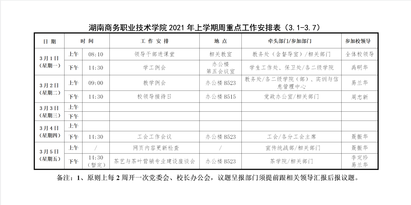 湖南商务职业技术学院2021年上学期周重点工作安排表(3.1-3.7)