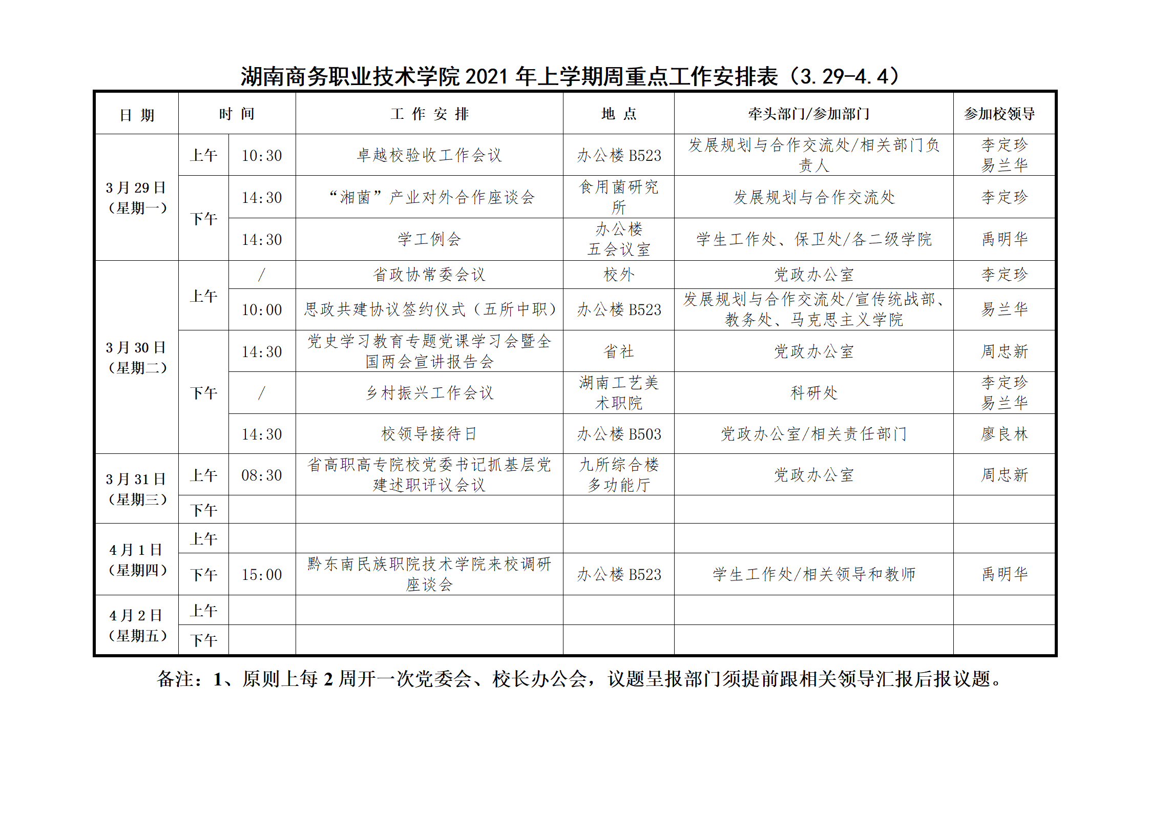 湖南商务职业技术学院2021年上学期周重点工作安排表(3.29-4.4)