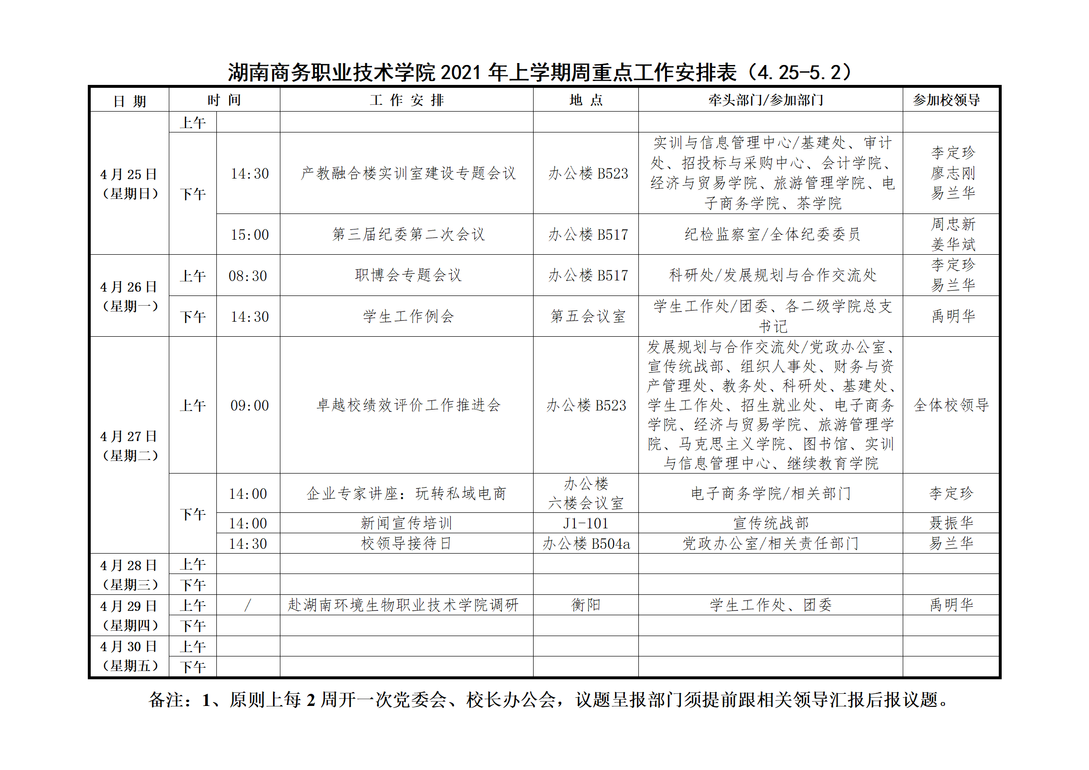 湖南商务职业技术学院2021年上学期周重点工作安排表(4.25-5.2)