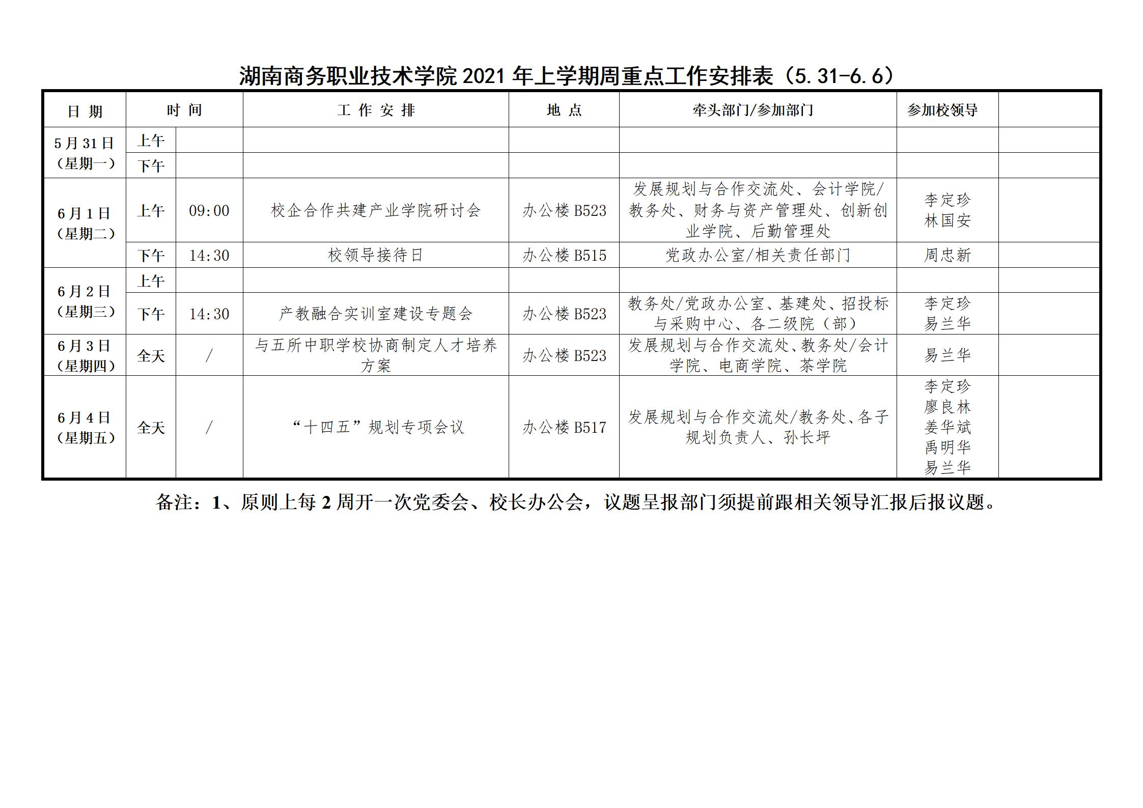 湖南商务职业技术学院2021年上学期周重点工作安排表(5.31-6.6)