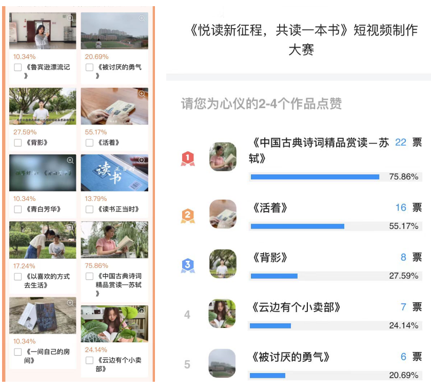 6月21日,电商学院党总支全体党员一起观看了入围短视频作品,并进行了投票评选,最终《中国古典诗词精品赏读—苏轼》、《活着》、《背影》等三本书的推荐主题视频以其拍摄画面精美、书籍介绍引人入胜、读书感悟深刻等优势排名前列,被评选为支部最受喜爱的书籍推荐视频。