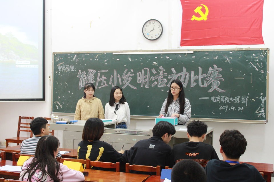 2019年4月25日中午12点30分,为了希望同学们能充分的发挥主观能动性,制作一些小发明去缓解心里压力。电商学院在二教101教室举行了解压小发明比赛活动。