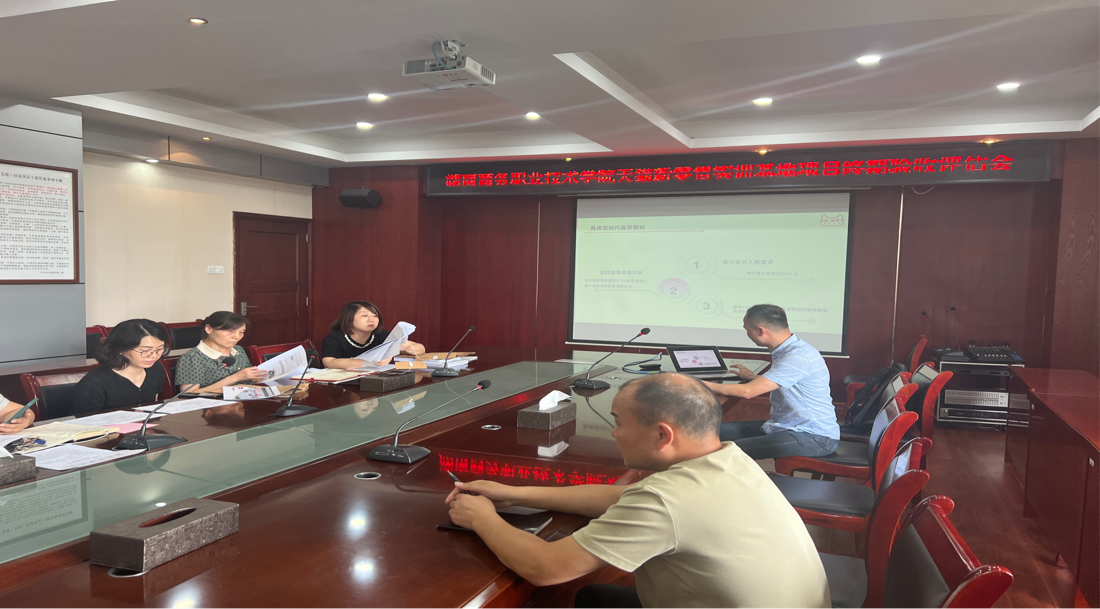 7月5日下午在办公楼523会议室, 天猫新零售实训基地项目终期验收评估会在湖南商务职业技术学院办公楼B523举行。发展规划与合作交流处、教务处、后勤管理处、财务与资产管理处、科研处等相关职能部门负责人以及电子商务学院负责人和项目合作企业代表参加会议。