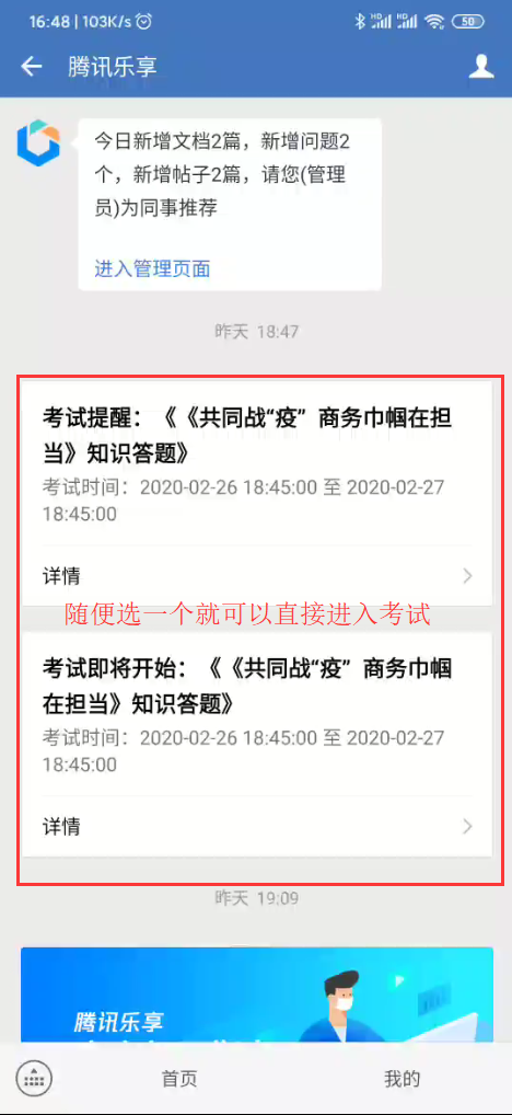 注意:如果您在“消息”中收到了“腾讯乐享”的考试提示,可以不用参见此后的操作步骤了。消息中的考试提示如下图: