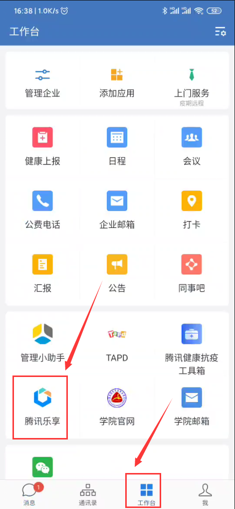 二、找到企业微信中的“工作台”->“腾讯乐享”