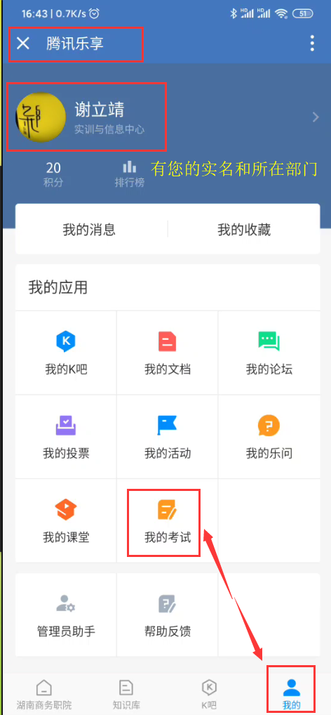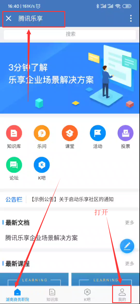 三、打开“腾讯乐享”->“我的”。注意,屏幕左下角应该是“湖南商务职院”字样,否则说明您到了别人家。