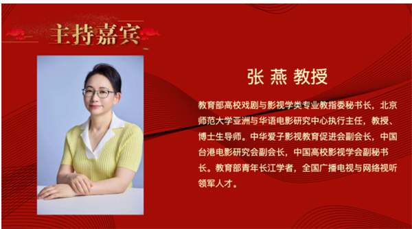 本次讲座由教育部高校戏剧与影视学类专业教指委秘书长张燕教授主持。张燕教授还是北京师范大学艺术与传媒学院教授、博士生导师,教育部青年长江学者,北京师范大学亚洲与华语电影研究中心执行主任。中华爱子影视教育促进会副会长,中国台港电影研究会副会长兼香港电影委员会执行主任,中国高校影视学会副秘书长。全国广播电视与网络视听领军人才,北京市广播电视与网络视听领军人才。
