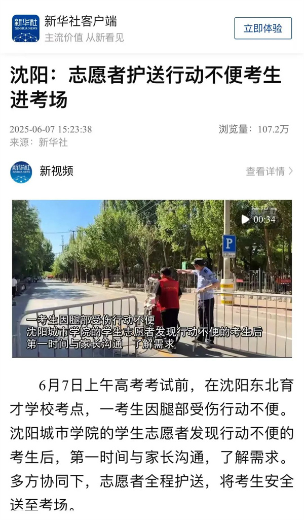6月7日,高考第一天,沈阳城市学院青年志愿者团队以饱满的精神状态,为考生及家长提供全方位助考服务。期间,我校志愿者送行动不便考生进考场的暖心事迹,被新华社和辽宁日报报道,截至目前,全网阅读量已破百万。我校志愿者团队的“爱心护考”志愿服务行动,也被辽宁交通广播、辽沈晚报、沈阳广电云盛京、共青团沈阳市委员会“青春沈阳”等媒体相继报道。