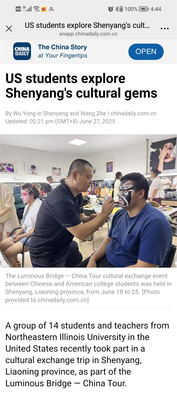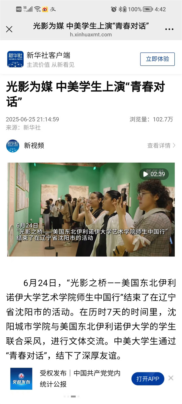 6月24日,“光影之桥——美国东北伊利诺伊大学艺术学院师生中国行”结束了在辽宁省沈阳市的活动。在历时7天的时间里,沈阳城市学院与美国东北伊利诺伊大学的学生联合采风,进行文体交流。中美大学生通过“青春对话”,结下了深厚友谊。