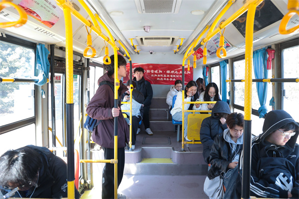 中午12:45,首班车准时发出。刷码、上车、落座,一气呵成。车厢里,是同学们兴奋的交谈和拍照打卡声。没有辗转换乘的周折,没有路边久候的不安,这不仅仅是一趟公交车,更是一份从校门开始的“专属礼遇”,一份“被学校放在心上”的踏实温暖。 2025级财务管理专业张宸熙说:“体验感超棒!在校内固定点位上车,时间也是固定的,车上都是同学,非常亲切。”