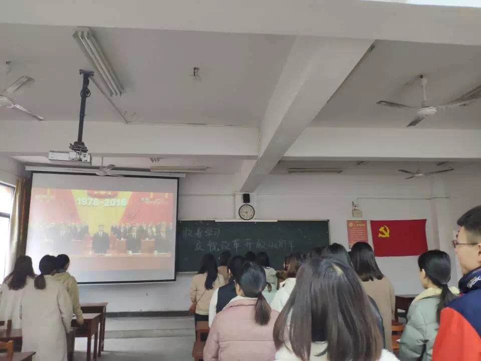 2018年12月19日中午12:30,会计学院学工一、二党支部学生党员在J2-201组织收看庆祝改革开放40周年大会。