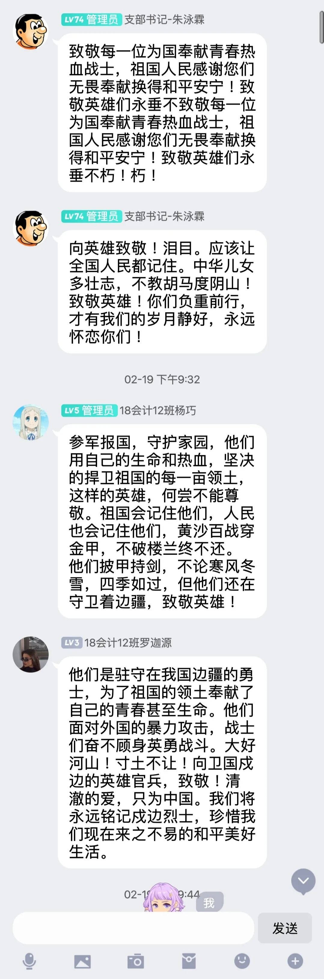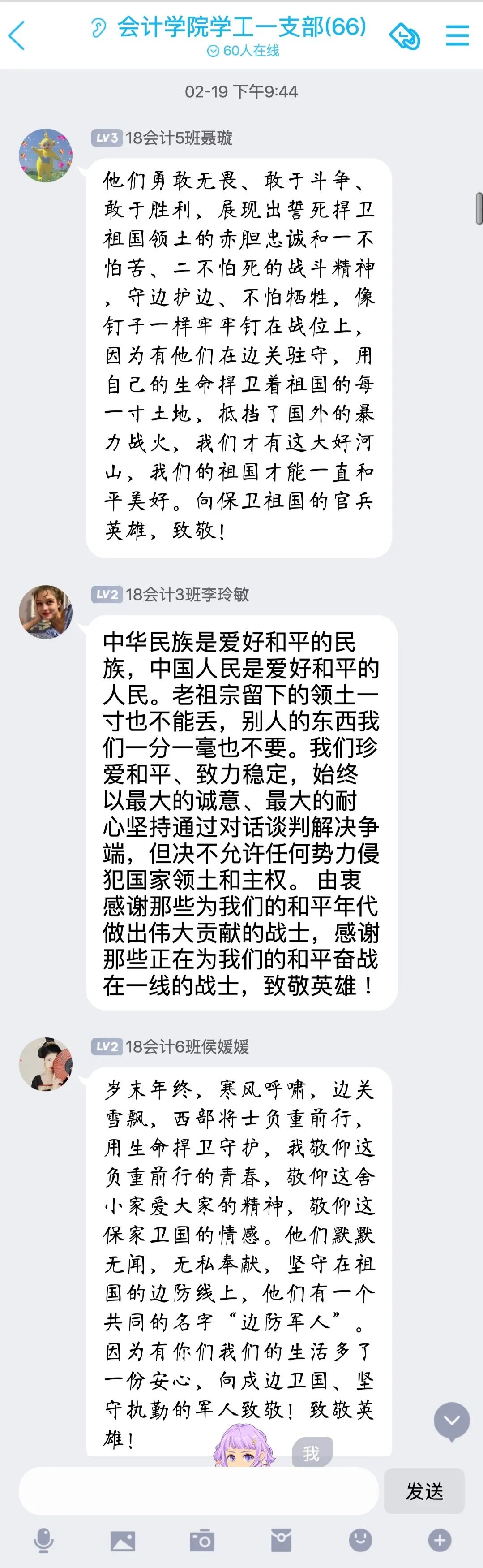 全体党员仔细阅读并认真学习了“军报独家报道:英雄屹立克拉昆仑”后,各自有感而发,在QQ群内积极分享了自己的学习心得,表达了对戍边英雄的敬重与感恩之情,并且大家纷纷表示要学习他们这种无私奉献、艰苦奋斗、报效祖国的精神,不断为祖国的美好未来而奋斗!