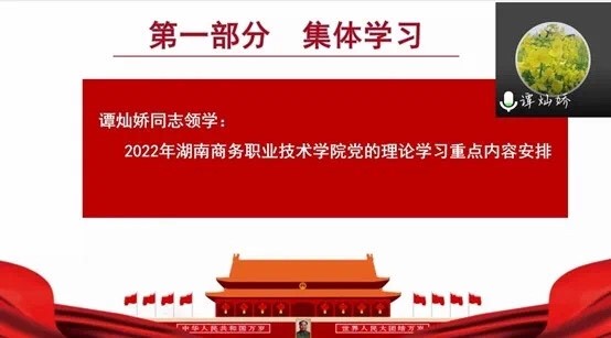 活动伊始,支部书记谭灿娇同志领学2022年湖南商务职业技术学院党的理论学习重点内容安排,她强调,我们要切实增强“四个意识”、坚定“四个自信”、做到“两个维护”,以高度的政治责任感和饱满的精神状态做好迎接、学习、贯彻党的二十大各项工作。