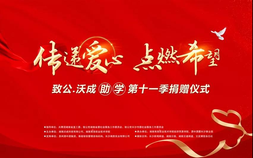 2018年在致公党湖南省委、致公党长沙市委的指导下,湖南沃成科技有限公司捐资20万元和湖南商务职业技术学院继续合作开办了“致公•沃成班”,帮助50名来自山区的经济贸易学院市场营销专业学子完成学业。在2018年10月启动的第十一季“传递爱心•点燃希望” 助学公益活动中,“致公•沃成班”学生参与宋代官窖、酒中酒霸在全国秋季糖酒会的品牌推广招商活动,锻炼学生的实践能力,同时从招商奖励中提取五万元善款,捐赠给新化县琅塘镇龙通完小,给山区的孩子传递一份爱心和温暖。