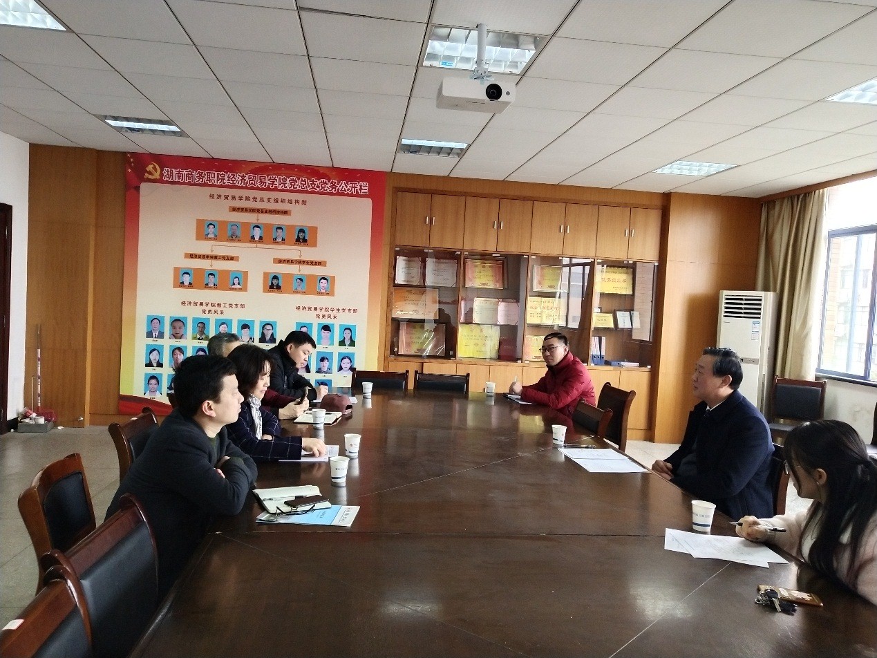 听完课后,周忠新来到经济贸易学院院部展开调研,进行现场办公。经贸学院辛磊院长、经贸学院皮卫书记、湘茶学院易能院长和经贸学院谢虎军副院长分别就专业建设、课程建设、项目建设、学科发展、制度管理、团队打造、党建思想、特色辅导室建设、社会培训等方面的工作和困难进行汇报。