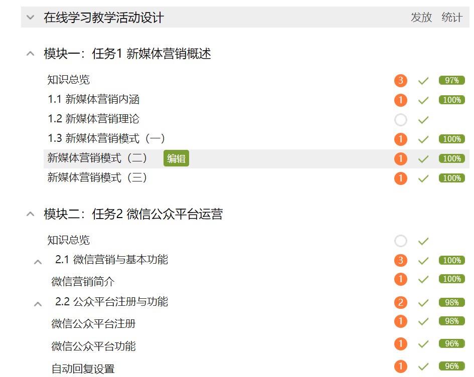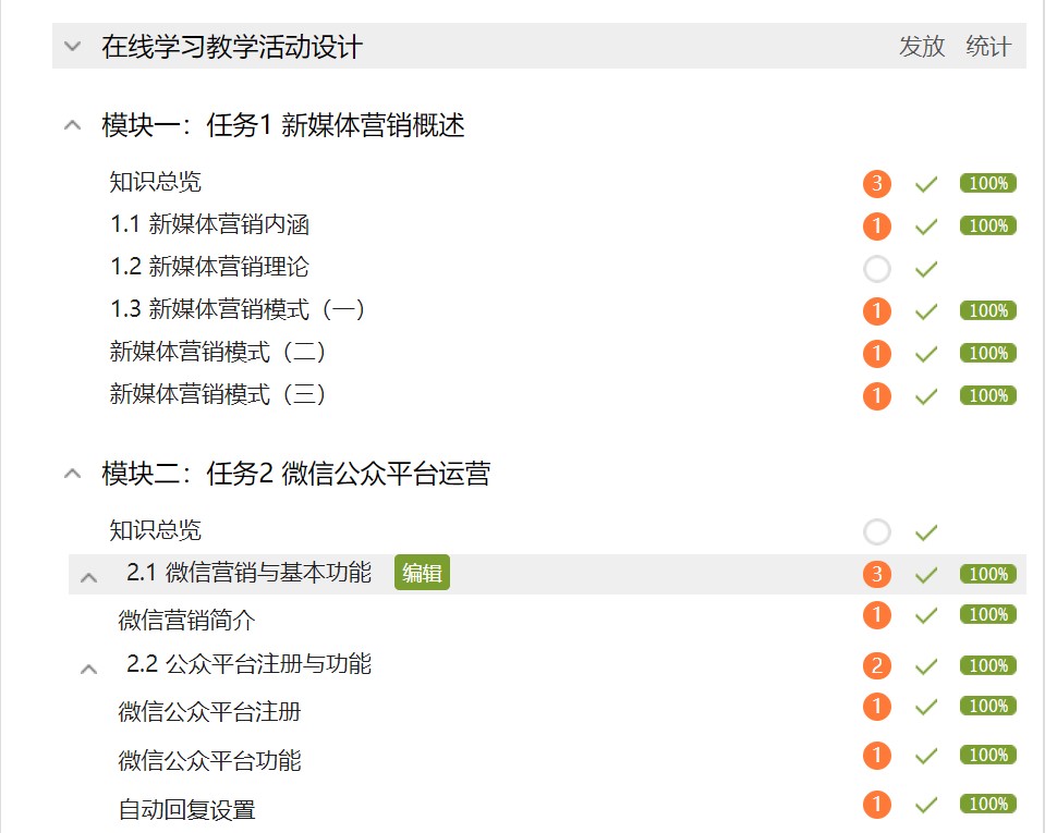 2月5日,湖南省精品在线开放课程《新媒体营销》第三期于学银在线平台正式开课。一个多月以来,云端课程不仅运行顺利,而且交出了漂亮的答卷。115所院校学员选修,14所院校选用,21名教师执教,39个班级教学,2481名学生学习,117万多页面浏览,118次课程公告,8500余次互动交流,这是截止3月18日《新媒体营销》的当期教学数据。这串令人惊喜的数字背后凝聚了课程负责人黄慧化副教授及其教学团队的良苦用心。
