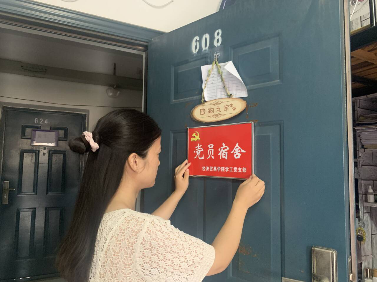 经贸学院党小组组长孔霞同志为党员宿舍挂牌