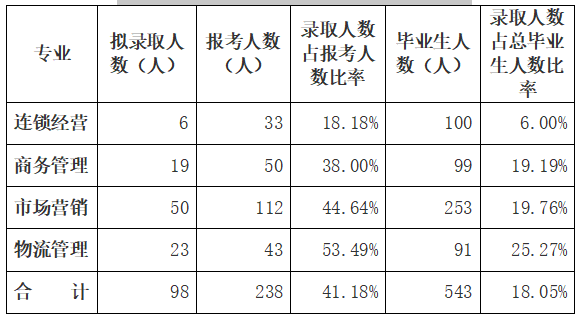 其中,市场营销拟录取人数为50人,市场营销专业为平行对口专业。据统计,在我院市场营销专业5个平行班级中,18级市场营销2班、3班录取率超过班级总人数的20%。人力资源管理拟录取人数为25人,为我院商务管理专业和连锁经营与管理专业对口专业。物流管理拟录取人数为22人,物流管理专业为平行对口专业,录取比率高达25.27%。