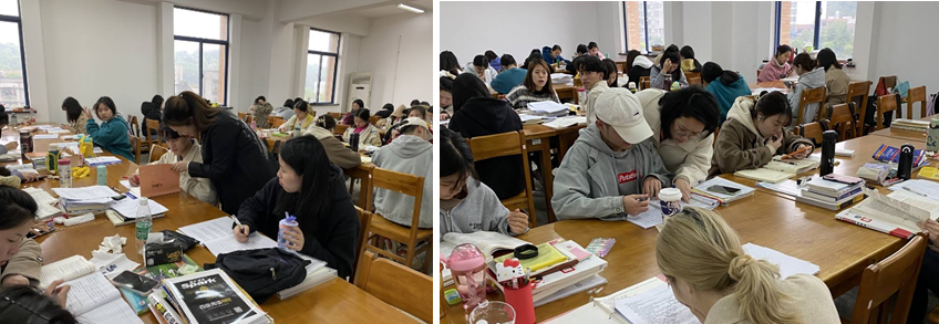 学校图书馆是同学们备考的战场。每天,经济贸易学院的辅导员老师都会抽空去看看自己班上的“崽崽”。看他们学习状态是否还在线,有没有在坚持,心里有没有烦恼……辅导员莫英老师还为班上的学生辅导员英语。一天又一天,叮嘱“注意身体、规律睡眠和饮食”是常态。