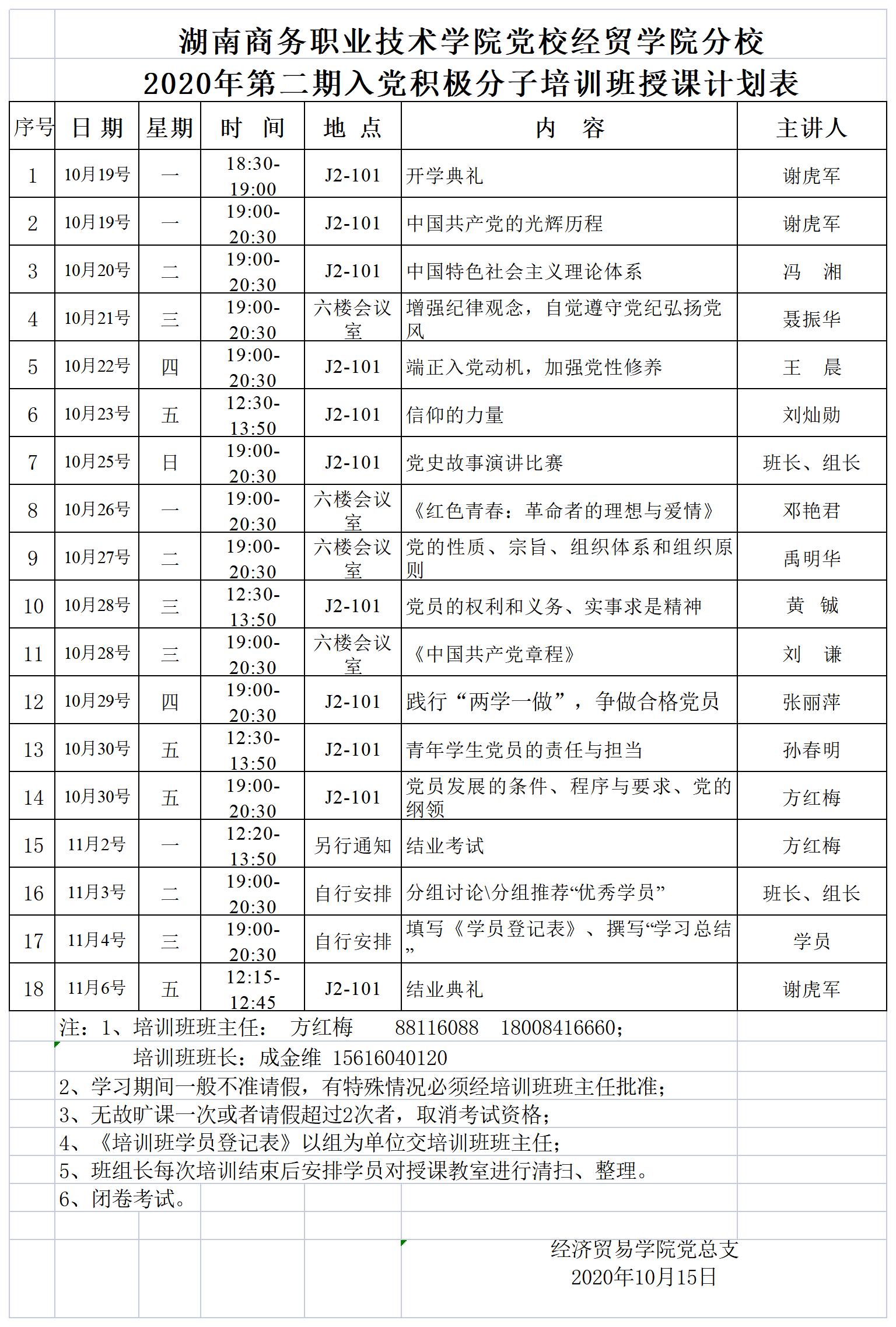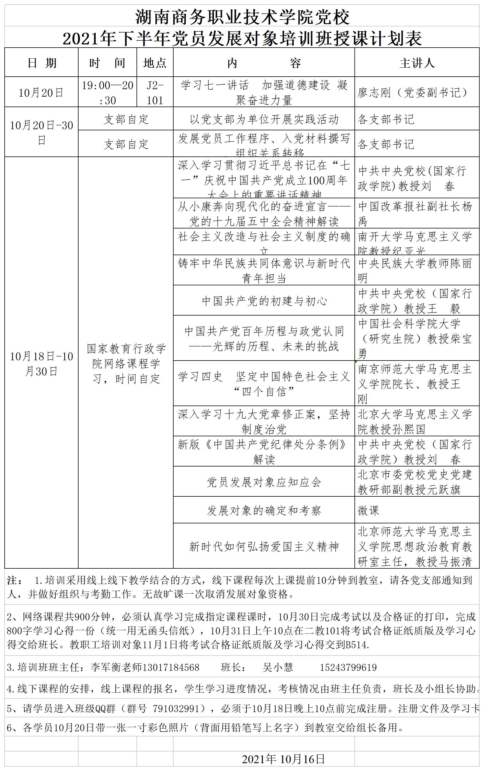 湖南商务职业技术学院党校2021年下半年党员发展对象培训班授课计划表