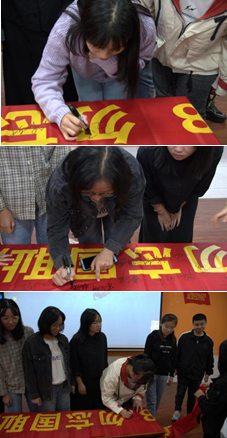 党员同志们积极在“勿忘国耻,牢记历史使命”红色横幅上签名