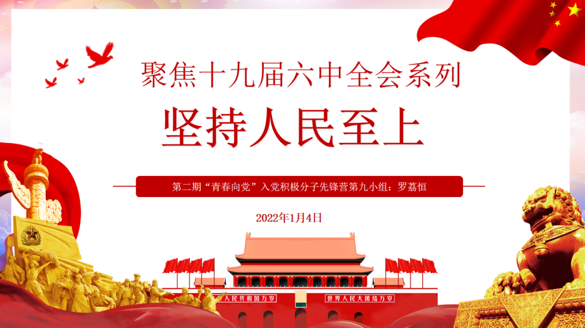 (通讯员 赵清颖)“站在人民的一边,才能赢得民心。”为深入学习党的十九届六中全会精神,深刻理解“坚持人民至上”的重要意义,1月4日19:00,经济贸易学院学工党支部于二教101教室(经济贸易学院分党校)组织开展“聚焦十九届六中全会”第五次主题党日学习活动——“坚持人民至上”。此次活动由第二期“青春向党”入党积极分子先锋营第九小组罗荔恒同学主持,经济贸易学院学工党支部全体党员、入党积极分子参加此次活动。