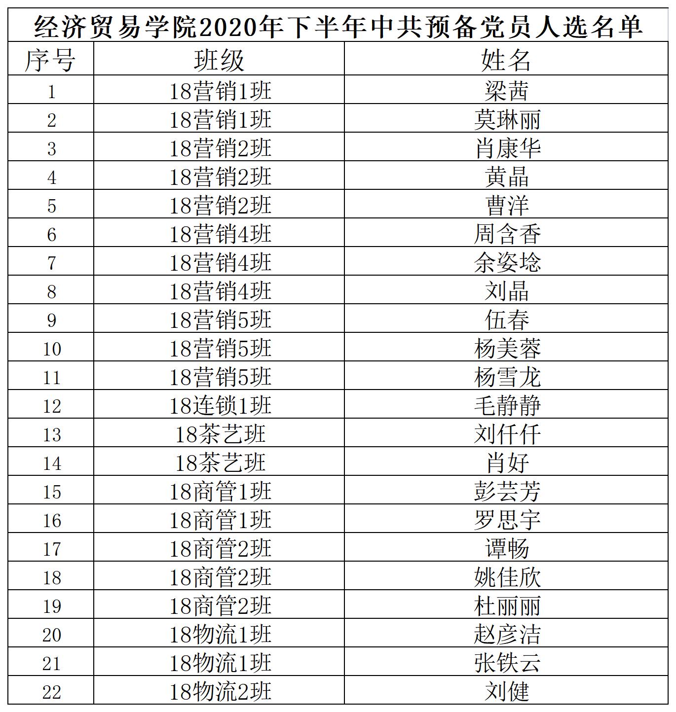 经本人申请、党校培训、党支部培养教育和考察,将梁茜等22名同志接收为中共预备党员,并于近期召开支部大会讨论。为发扬民主,广泛听取群众意见,根据党组织关于发展新党员实行公示的规定,现将18名同志情况予以公示: