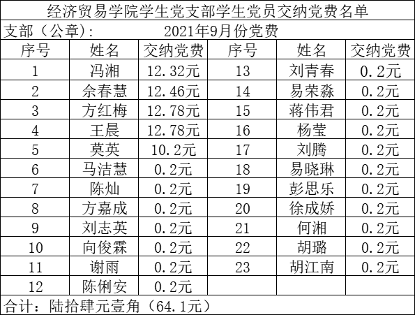 (通讯员 周自立)为进一步提高党员党性修养,增强责任感和使命感。2021年9月7日,经济贸易学院学工党支部开展第二十一期“主动交纳党费,做合格党员”主题活动。此次活动由经济贸易学院学工党支部全体党员参加。