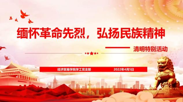 (通讯员 李蕾)4月5日,又是一年清明节,中华民族祭祖扫墓、缅怀先烈的日子。经济贸易学院学工党支部联合经济贸易学院团总支以线上会议形式组织开展“缅怀革命先烈,弘扬民族精神”主题党日活动。本次主题党日活动由第二期“青春向党”入党积极分子先锋营第二小组李素珍同学主持,经济贸易学院学工党支部全体党员、入党积极分子以及青年团员参加本次活动。