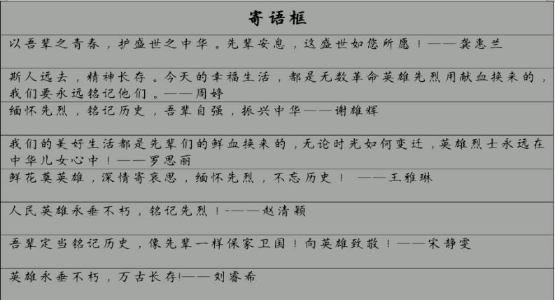 视频讲述了杨根思先辈“三不相信”精神:“不相信有完成不了的任务;不相信有克服不了的困难;不相信有战胜不了的敌人”。主持人强调:“‘三个不相信’精神现已成为中华民族战胜困难走向胜利的宝贵精神财富。新的时代,我们要学习传承英雄杨根思的不屈意志、不朽精神。作为共和国仅有的两位特战斗英雄之一,杨根思先辈用行动表明他决心,用生命守护国家。”紧接着,主持人组织大家开展“清明祭英烈”寄语活动。同学们用感动的笔触纷纷表达对革命先烈缅怀之情。