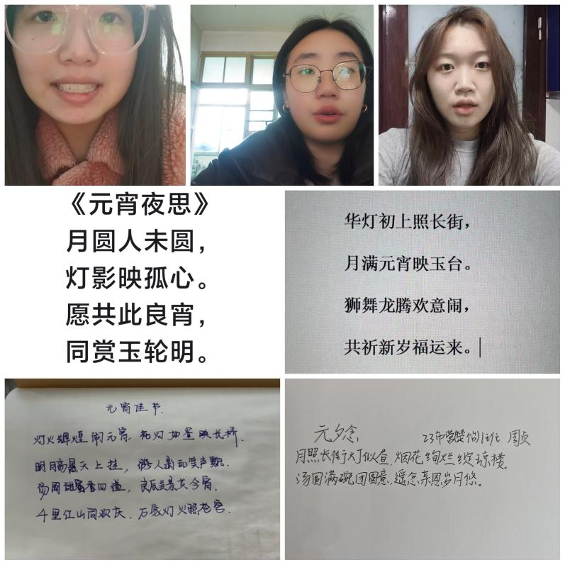 在诗词创作环节中,大家通过一首首饱含深情的诗词,展现了对元宵传统文化的深刻理解和独特感悟。同学们围绕元宵节主题,通过阅读经典诗词汲取灵感,结合自身感受与经历的同时,发挥想象力与创造力进行创作,并以录制视频的方式分享作品。