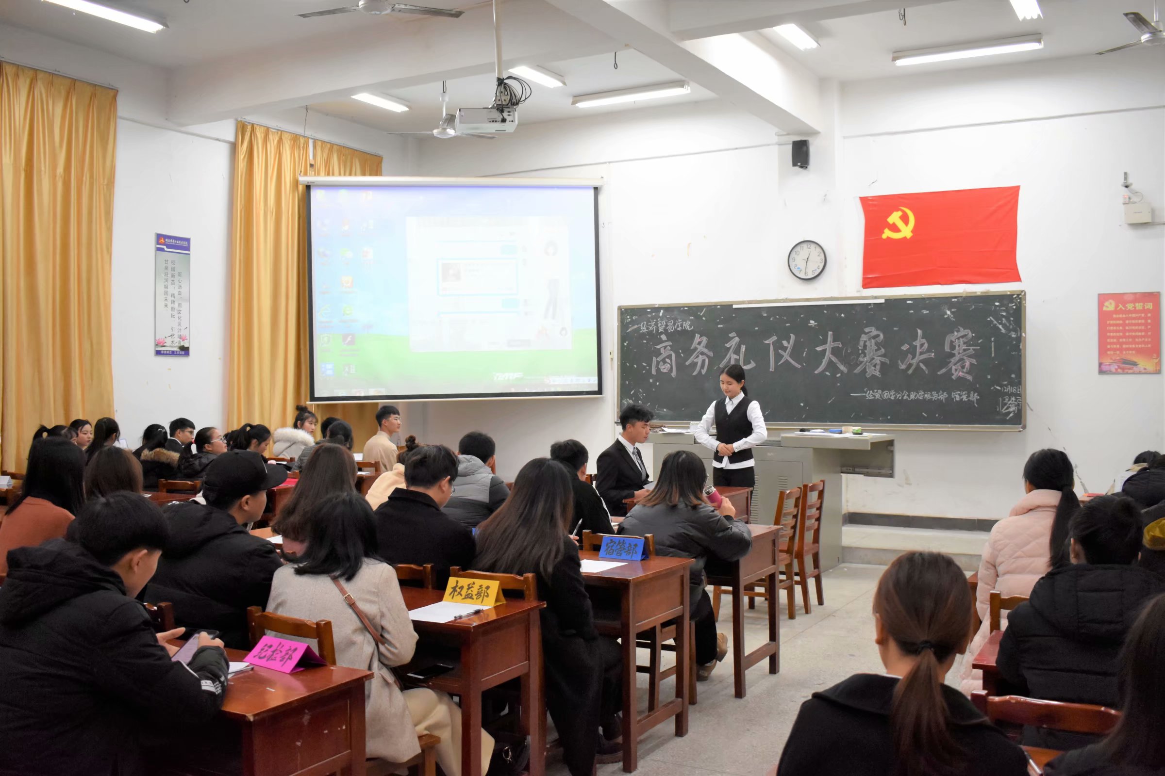 为提高同学们的个人素质和修养,打造一个展示自己风采的舞台。2018年12月19日中午12:15,由经贸学院助学服务部主办的第二届商务礼仪风采大赛决赛于二教101举行,评委出席本次活动为主席团、各部门部长。经过初赛的重重选拔,最终14支队伍进入决赛。