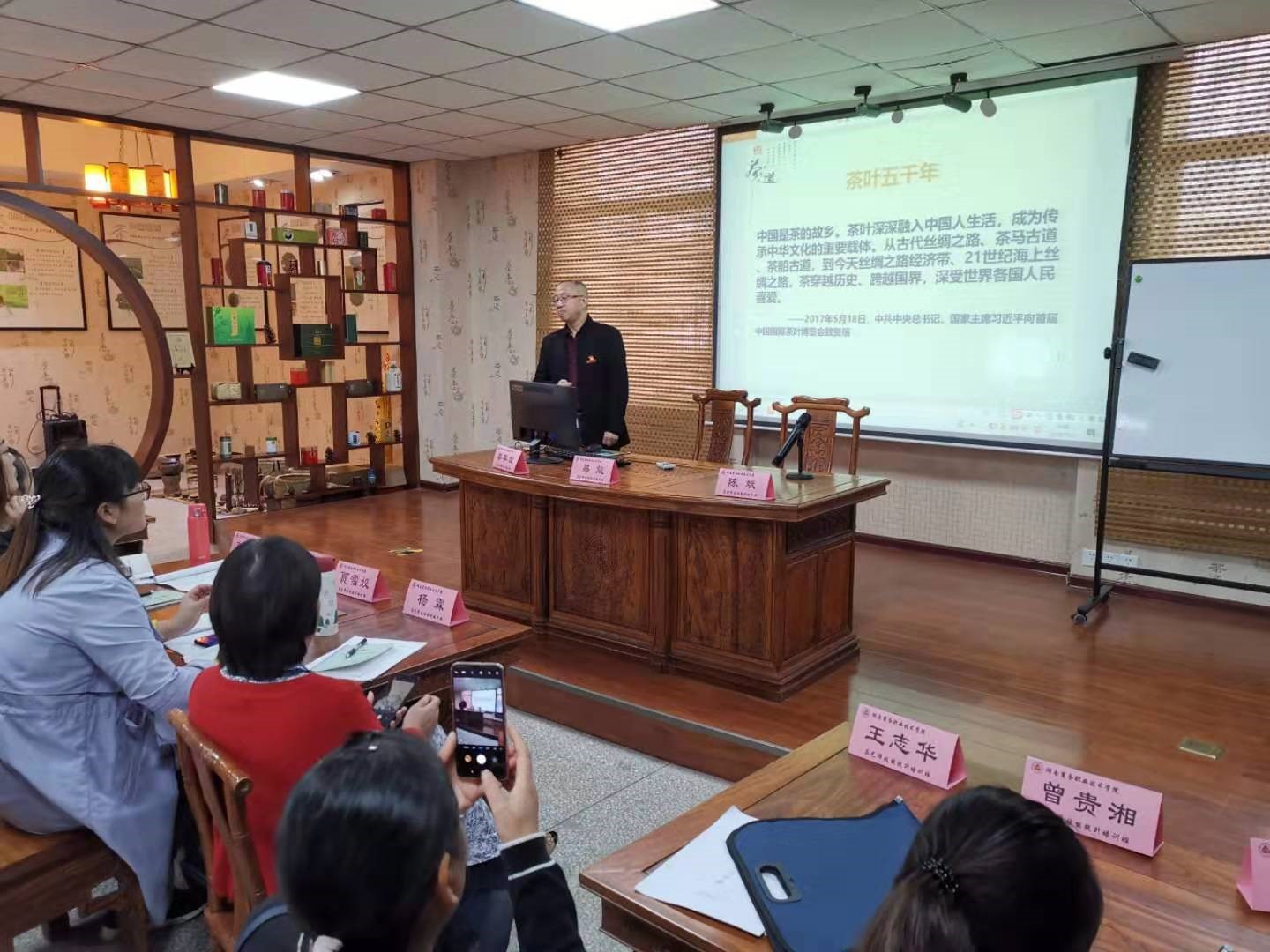 为了弘扬湘茶文化,助力乡村振兴,助力湖南“千亿茶产业”目标实现,提升从事茶叶工作劳动技能,提高从业人员收入,在湖南省工会和学校领导支持下,湘茶学院联合继续教育学院共同承办了茶艺师技能提升培训班,2019年11月1日开班仪式在学院办公楼五楼茶艺室举行。湘茶学院院长易能、继续教育学院院长姜华斌、副院长陈斌参加了开班仪式。