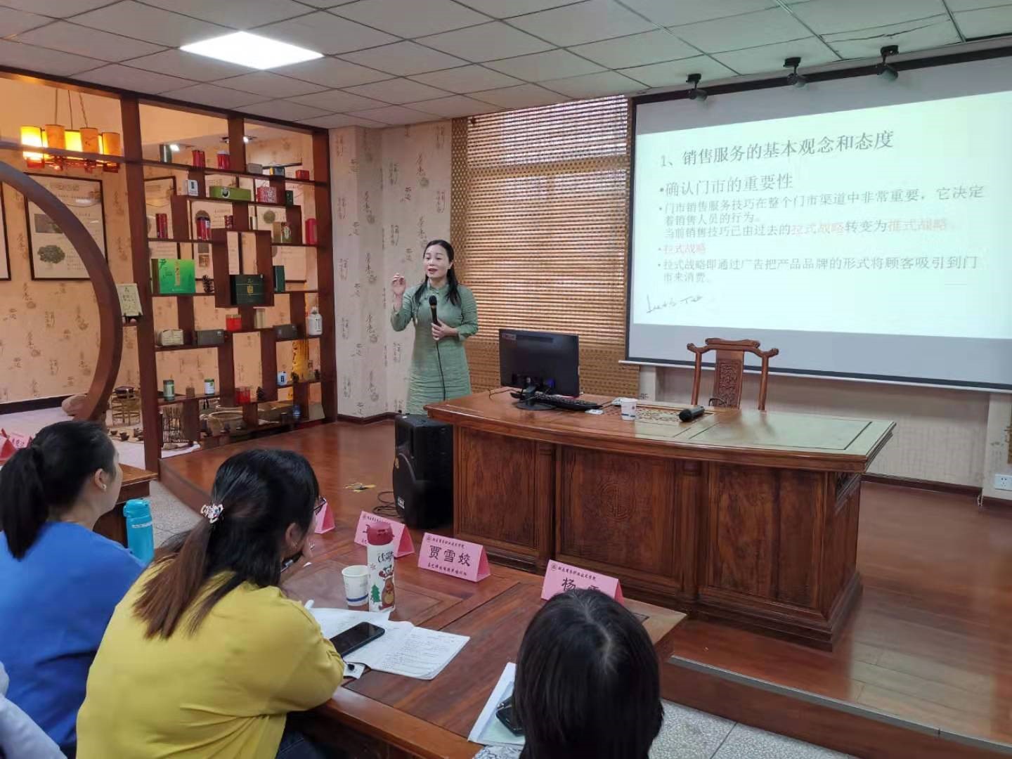图四:湖南省唐羽茗茶有限公司常务副总经理讲解茶叶门店销售技巧