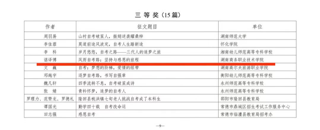 1 月 8 日,由湖南省教育厅、湖南省教育考试院、湖南日报社联合主办的湖南省“自学考试改革发展 40 年”主题活动评选结果出炉。我校会计学院 22 级学生谌译博撰写的《风雨自考路:坚持与感恩的旅程》荣获三等奖。