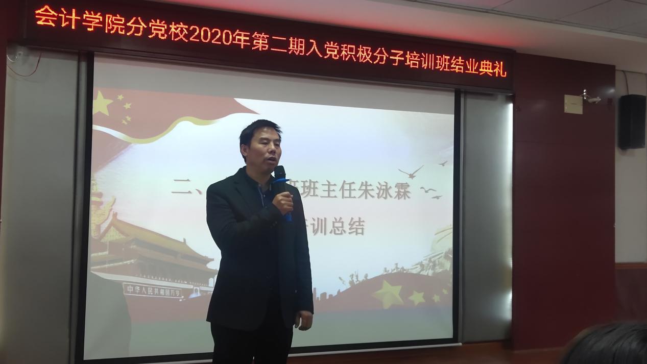 2020年11月5日中午12:30整,在二教201举行了中共湖南商务职业技术学院会计学院分党校2020第二期入党积极分子结业典礼。出席本次典礼的老师有会计学院党总支书记黄铖、学工一党支部书记朱泳霖以及全体第二期入党积极分子,本次典礼由黄姗姗主持。