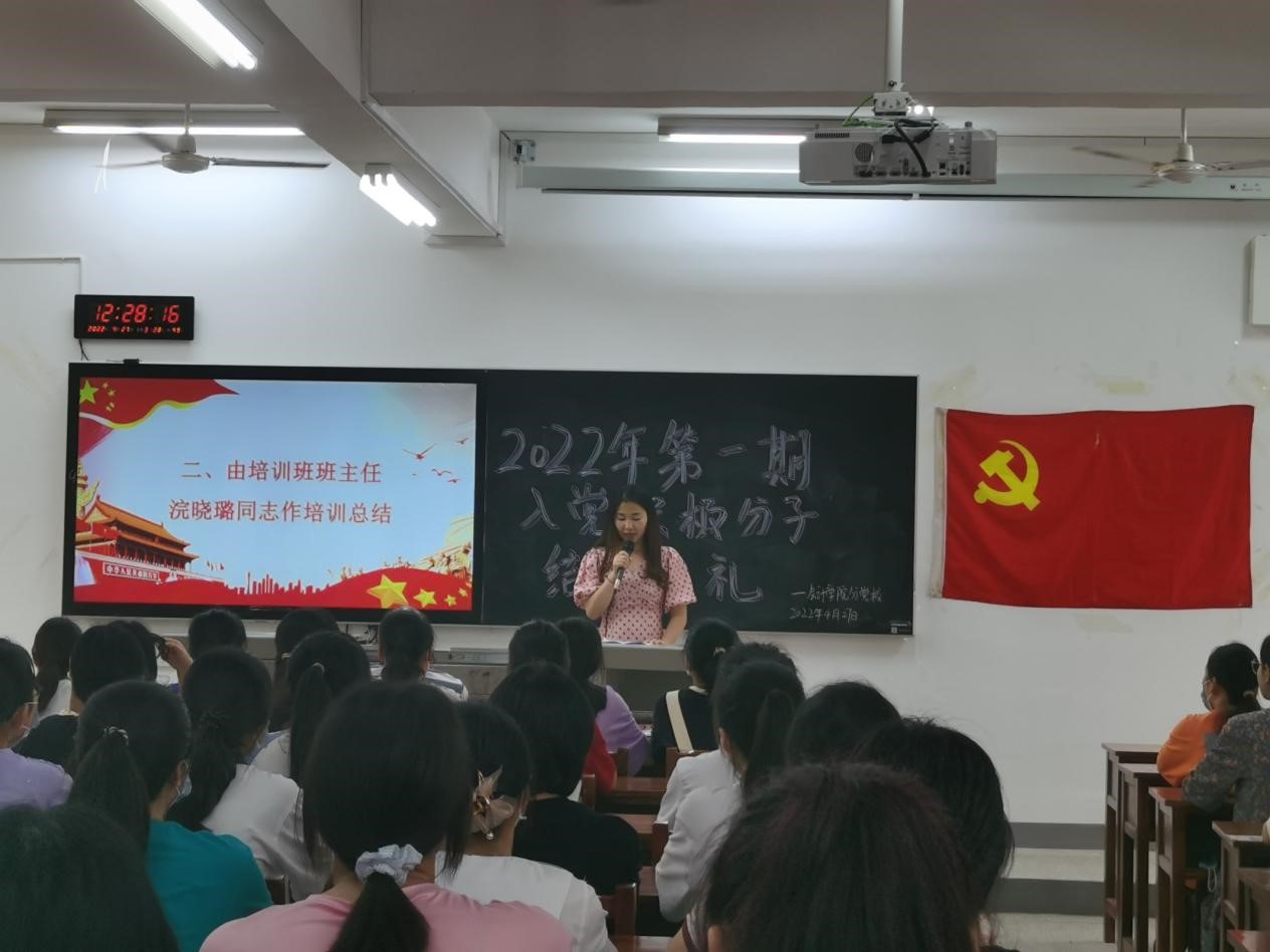在庄严肃穆的国歌声中,本次结业典礼正式开始。活动伊始,由浣晓璐同志作培训总结,她首先对通过结业考试的学员表示祝贺,她谈到,作为一名入党积极分子要时刻以党员的标准严格要求自己,不断培养自己坚韧不拔的意志,不能骄傲自满,在学习生活中起带头作用。