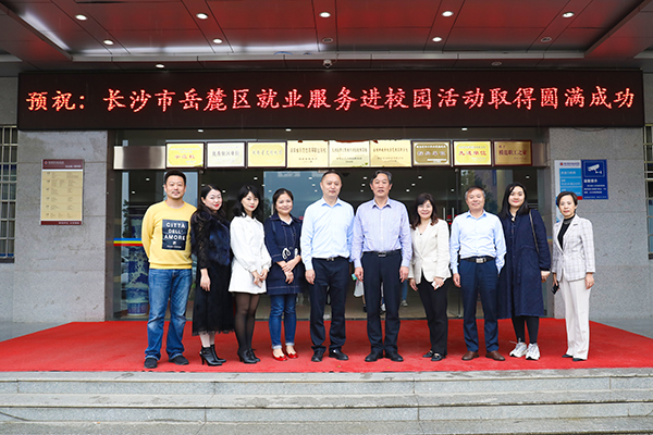 本网讯(记者赵超越 实习记者刘芊宇 张晶 谢娜)为进一步拓宽毕业生就业渠道,为毕业生提供现场面对面洽谈就业的机会,10月22日下午14时,长沙市岳麓区就业服务进校园活动暨我校2020届毕业生首场校园招聘会在办公楼一楼大厅隆重举行,该活动由岳麓区人民政府主办,我校与岳麓区人力资源和社会保障局联合承办。岳麓区人社局党组成员朱能文、校党委书记周忠新、党委委员禹明华等亲临现场,看望慰问参会企业和学生。