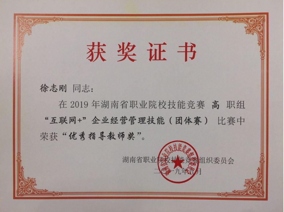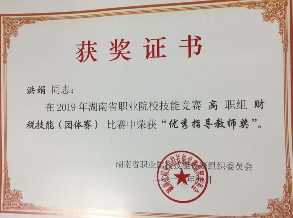 2019年9月,我院徐志刚老师在2019年湖南省职业院校技能竞赛高职组“互联网+”企业经营管理技能(团体赛)中荣获“优秀指导教师奖”;张亚清老师在2019年湖南省职业院校技能竞赛高职组会计技能(团体赛)中荣获“优秀指导教师奖”;洪娟老师在2019年湖南省职业院校技能竞赛高职组财税技能(团体赛)中荣获“优秀指导教师奖”。