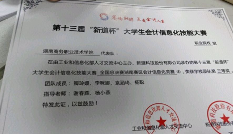 2019年12月,在第十三届“新道杯”大学生会计信息化技能大赛全国总决赛湖南赛区管理会计竞赛项目中,由谢春辉、杨小燕老师指导的两支参赛队伍均荣获了一等奖,其中一队由会计学院17会计2班袁涵琦、17会计4班杨聪、17会计1班卿玲媛,17会计2班李咪娜组成;另一队由18会计9班廖勋煌、18会计4班王金花、17会计2班肖琪、17会计2班吴利荣组成。指导老师谢春辉、杨小燕荣获“优秀指导老师”称号。